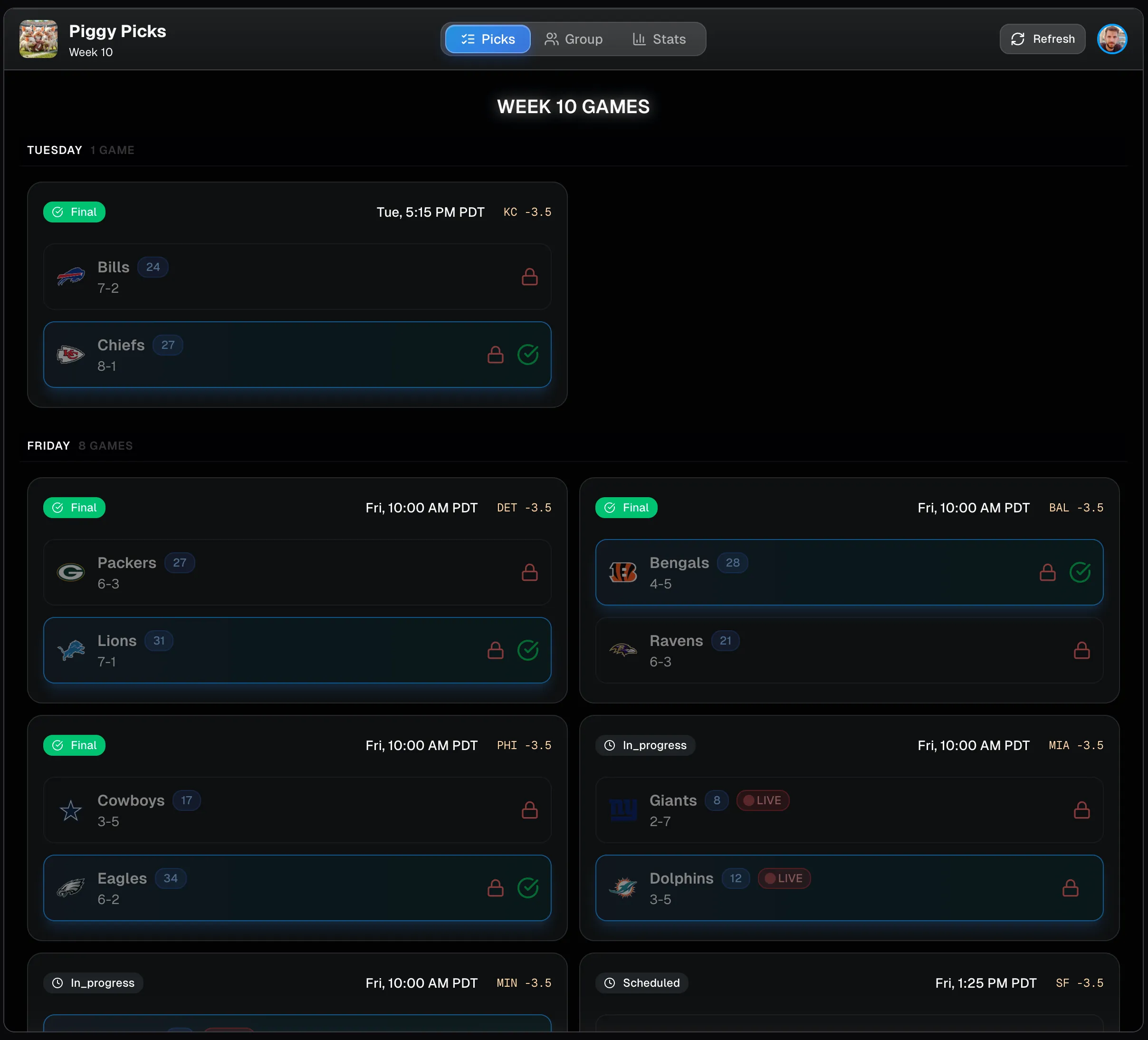 NFL Pick’em for our decade-old friend group. Full-stack, real-time scores, the whole nine.
